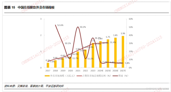 外卖行业迅速崛起,在餐饮业规模占比逐年提升。据艾媒咨询,我国在线外卖行业市场规模由2017年0.30万亿元增至2023年1.53万亿元;在线外卖市场占餐饮市场总规模的比例逐年上升,由2017年7.6%上升至2023年29.4%,外卖在人们的生活中占据着越来越重要的地位,预计未来外卖行业将继续保持增长趋势。
