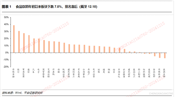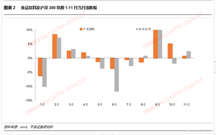 需求弱复苏,跑输沪深大盘。食品饮料板块受需求端影响,基本面表现疲软,股价阶段性承压。自年初以来(截止至12月10日),食品饮料板块下跌5.0%,跑输沪深300指数16.5pct,在申万一级子行业中排名倒数第三。按月份来看,食品饮料板块在2月、3月、4月、8月、9月、11月录得正增长,仅在3月、8月、9月、11月跑赢沪深300指数。
