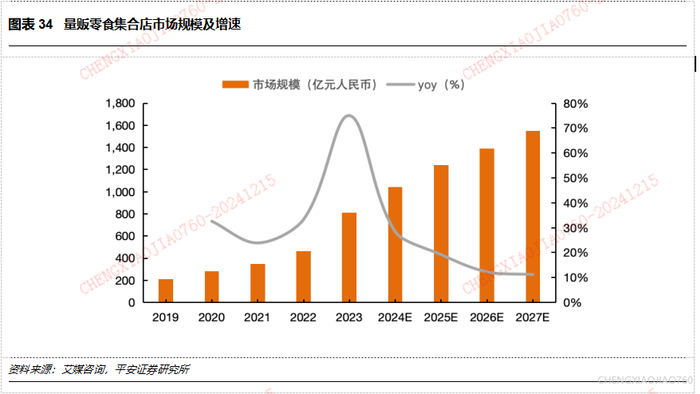 量贩零食连锁竞争进入下半程,三分天下格局或将形成。根据艾媒咨询,量贩零食集合店的市场规模已由2019年的211亿元增长至2023年的809亿元,预计2027年将达1547亿元,成为零食行业中增速最快的渠道。当前零食很忙和赵一鸣合并为鸣鸣很忙集团并宣布破万店;万辰集团将旗下的来优品、好想来、吖嘀吖嘀、陆小馋四大品牌整合为“好想来品牌零食”;2024年10月三只松鼠公告收购湖南爱零食科技有限公司、未来已来(天津)科技发展有限责任公司、安徽致养食品有限公司的控制权或相关业务及资产,未来零食连锁渠道三分天下格局或将形成。