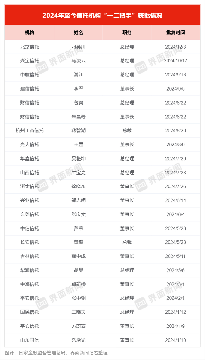 平安信托和财信信托的董事长及总经理均于年内获批上任;另有9家信托公司董事长迎新,9家机构总经理/总裁任命获批。