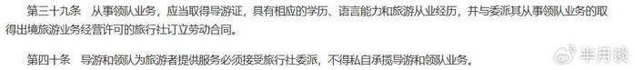 江苏省消保委平台发文称,依据《中华人民共和国旅游法》第三十九条和第四十条的规定,从事导游活动应当取得导游证,导游为旅行者提供服务必须接受旅行社委派,不得私自承揽导游业务。