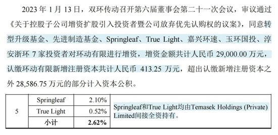 这轮融资股东阵容强大,不仅有转型升级基金和玉环国投这样的国有股东,还有外资淡马锡的身影,新增股东Springleaf和True Light由Temasek Holdings(淡马锡)间接全资持有。