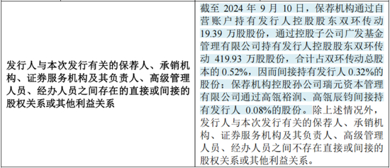 另外,发行前保荐机构广发证券通过自营账户及控股子公司广发基金间接持有公司0.32%的股份,广发证券控股孙公司瑞元资本间接持有公司0.08%的股份。