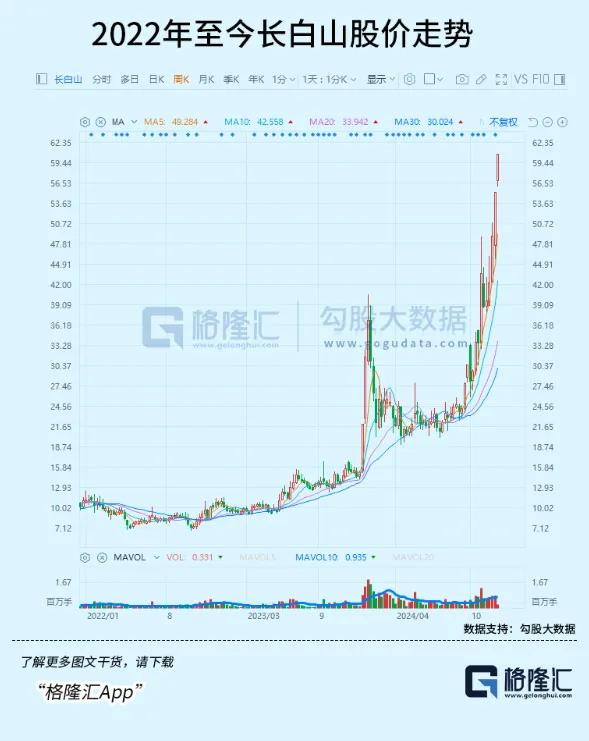 拉长时间看,从2022年10月至今,长白山股价从2022年最低点的6.78元涨到今天最高的60.67元,仅两年间已然涨近8倍涨幅!