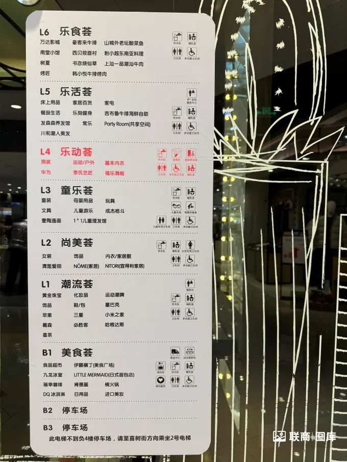 包括:从B1层至地上6层,每一个楼层都配置了免费的饮水机、多功能卫生间和哺乳室;3楼增设了母婴休息室、儿童专用卫生间以及儿童天地;4楼增设了女性专用卫生间;B1层增设了配送中心、寄存区、便民服务区、自动提款机;5楼增设了伊+会员服务中心和Party Room共享空间。
