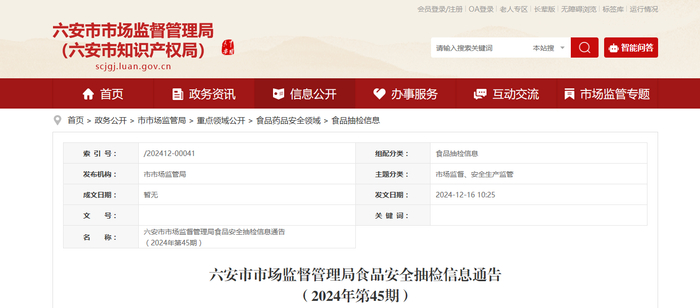 安徽省六安市市场监督管理局食品安全抽检信息通告(2024年第45期)