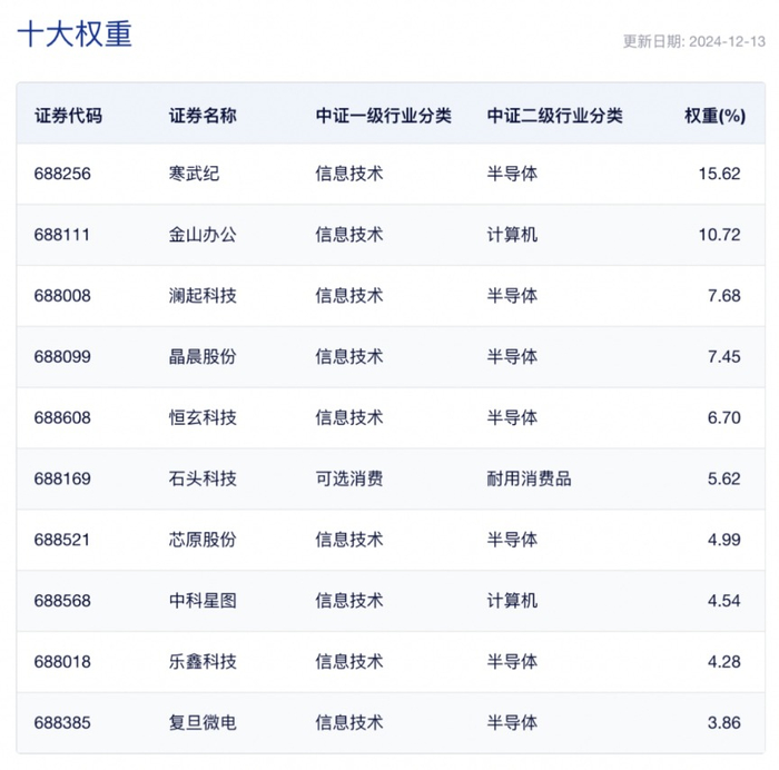 前十大重仓股依次是寒武纪、金山办公、澜起科技、晶晨股份、恒玄科技、石头科技、芯原股份、中科星图、乐鑫科技、复旦微电。