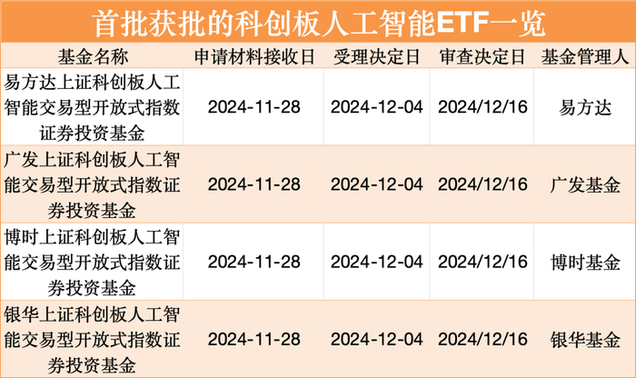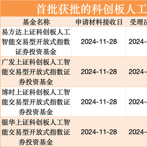 12月16日,包括易方达、广发、博时、银华在内的4家基金公司集体上报的首批科创板人工智能ETF正式获批,距离产品上报不到1个月时间,成为市场上首批推出的科创板人工智能ETF。