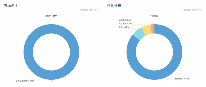 截至12月13日,该指数在具体行业分布上,信息技术占比达到85.76%,工业、可选消费、通信服务占比分别为6.42%、5.62%、2.2%。