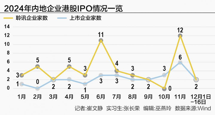 2023年全年,内地企业在港交所聆讯(IPO递表)的仅有10家。2024年,截至12月16日,这一数字已经高达52家,较去年同期暴增420%;仅11月新获港交所聆讯的内地企业即达12家,超过2023年全年之和。