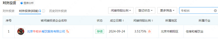 企查查显示,牛校长品牌隶属于北京牛校长餐饮服务有限公司,注册成立时间为2024年9月24日。王思聪旗下普思资本通过间接对外投资的形式获得了该公司超3.5%的股份。抖音账号“王校长的牛排(牛校长版)”发布了多条有关牛校长的短视频,其简介也显示,牛校长品牌的创始人为王思聪。