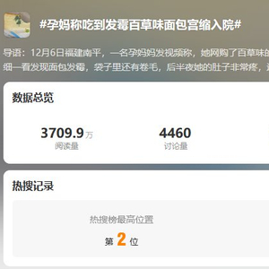 这一事件引发众多关注,“孕妈称吃到发霉百草味面包宫缩入院”话题冲上热搜第二,阅读量达到3709.9万。