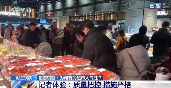 总台记者 王涛:我现在是在河南许昌胖东来超市的金汇广场店,可以看到,虽然晚上8点多了,这家超市目前人气依然非常旺,收银台前拍起了长队。胖东来在许昌共有11家超市,大家在网上了解比较多的是胖东来天使城店。由于客流量实在太大,每天客流量都有5万多人次,为了让员工能得到充分的休息,天使城店营业时间由晚上9点半改到8点结束。我所在的金汇广场店目前还是正常营业到9点半。
