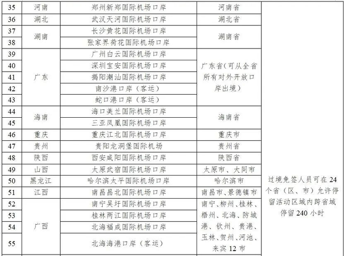 过境免签人员在安徽、海南、贵州3省停留活动区域为全省