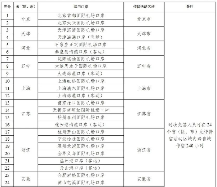 240小时过境免签政策适用口岸和停留活动区域↓↓