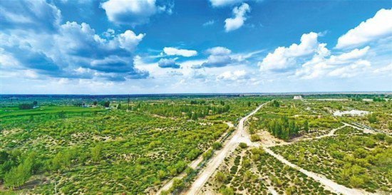 在一代代治沙人的努力下,榆林实现了从“沙进人退”到“绿进沙退”的历史性转变。图为位于毛乌素沙地腹地的靖边县红墩界镇白城则村一角(资料照片)。李旭佳摄