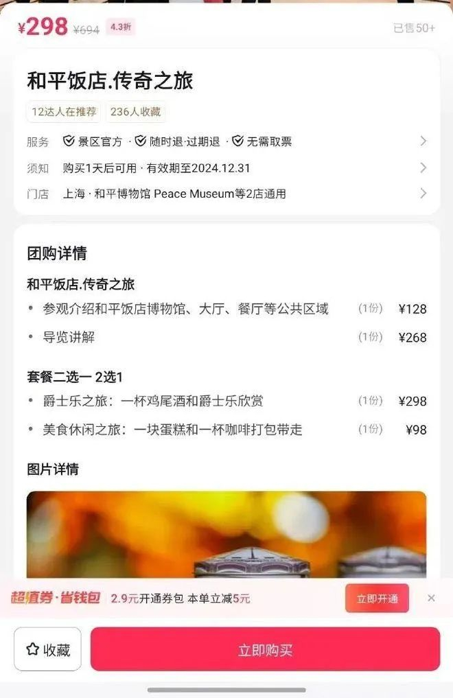 12月16日,记者联系上海和平饭店,工作人员告诉记者,网友所说的298元团购套餐实际上是一个参观服务,“是一直都可以购买的,并不是今年刚刚推出的”。和平饭店有一个微型博物馆,占地面积不大,主要是展出一些和平饭店的历史故事和物件,参观耗时15分钟左右,“住宿客人是免费参观的,单独参观的话需要收费,268元一位,工作人员可以帮客人打卡拍照”。