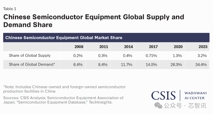 多年前,中国国内的半导体制造设备行业规模很小,技术水平也不及全球最先进的技术水平。根据CSIS统计的有关中国全球半导体制造设备市场份额在供需方面如何随时间变化的市场数据(见表 1)来看,在过去的 15 年里,中国作为半导体制造设备的供应商和买家都在成长。虽然中国半导体设备厂商在全球供应当中的份额在持续增长,但是目前占比仍然比较小,按照2023年全球半导体设备市场规模来看,中国半导体设备厂商仅拿到了3.2%的市场份额,在中国国内的市场份额也只有9.6%。不过,根据研究公司 Sanford Bernstein 估计,中国半导体设备供应商目前占据的中国国内市场份额为 15%。