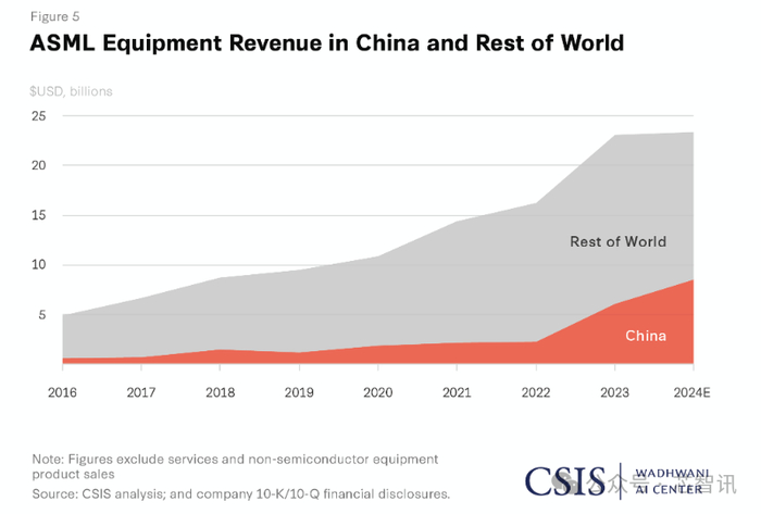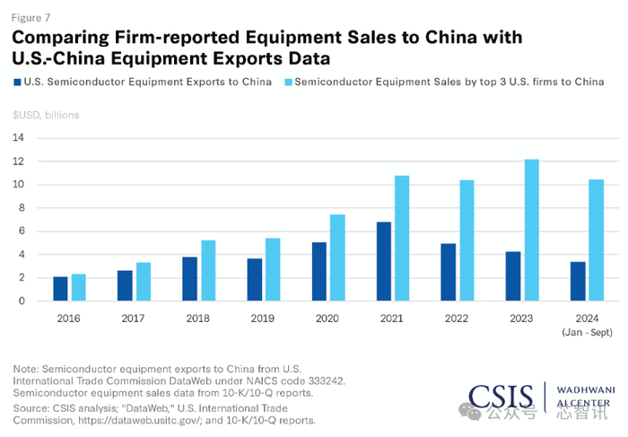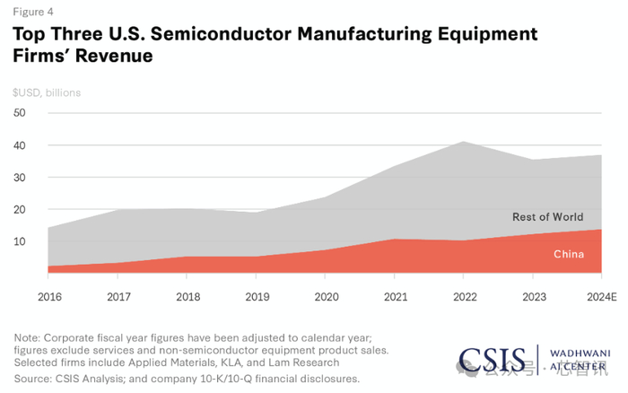 CSIS 对美国前三大半导体设备公司对中国半导体市场的销售收入进行了估计,方法是将其来自中国的收入减去报告为服务和非半导体设备业务(例如显示器、印刷电路板检测)的份额。该数字将包括这三家公司从其全球任何工厂运往中国的任何半导体制造设备销售额,无论这些工厂位于美国还是其他地方。