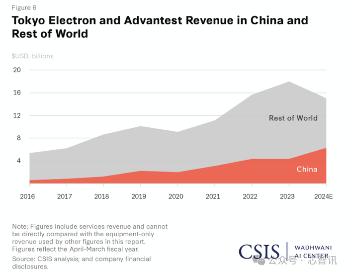 最后,日本两家领先的设备供应商 Tokyo Electron和爱德万也是如此,不仅自2016年以来,对华销售额持续增长,即便是在2023年日本跟进出台对华出口管制政策之后,2024年也维持了高速的增长。而且与世界其他地区相比,这两家公司在中国市场的表现都优于其他市场。