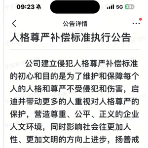 公示内容提到,公司建立侵犯人格尊严补偿标准的初心和目的,是为了维护和保障每个人的人格和尊严不受侵犯和伤害,启迪并带动更多的人重视对人格尊严的保护,营造尊重、公平、正义的企业人文环境,同时影响社会往更加人性、更加文明的方向上进步,扬善戒恶,促进人与人之间充满理解、尊重和友善,让社会更加文明和美好。