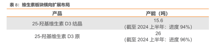 多维度横向拓展和持续的研发创新,实现单一产品到多维生素产品的转型,进一步巩固其全球市场的主导地位。公司在25-羟基维生素D3、饲料级和食品级维生素D3、维生素A粉、维生素E粉、维生素B6及生物素等产品上,扩大产能布局,逐步形成涵盖多种维生素的产品矩阵。构建完整产业链,推动多领域协同效应的发挥,助力业绩增长。