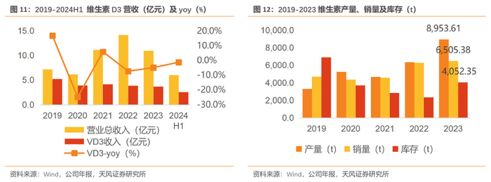 维生素D3是公司发展的基石,公司围绕维生素D3产品,构建了完整的上下游产业链,并扩展至化妆品原材料和医药保健品领域,已成为全球唯一的维生素D3全产业链生产企业。公司维生素板块主要产品为:羊毛脂胆固醇、维生素D3、25-羟基维生素D3等。2019年以来产量与销量呈现波动上升的态势,并在2023年创新高,库存的水平也维持在相对合理的范围内。
