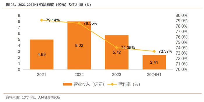 营收与毛利率的表现凸显双轮驱动的力量。公司医药板块营业收入从2021年的4.99亿元增长至2022年8.02亿元,2023年营收虽有所下降,但从毛利率来看,仍以74.05%保持在高位。2023年毛利率经历明显下降,但到2024H1下降趋势放缓。从公司拓展药品业务至今,药品毛利率整体维持在较高水平。