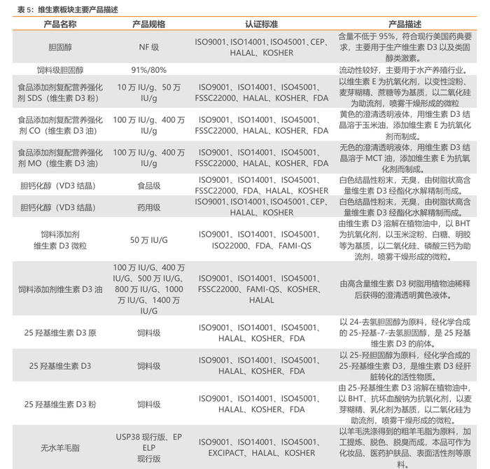 前端优势助力公司引领维生素D3行业市场。公司从上游的化工辅料和羊毛粗脂采购入手,自主生产精制羊毛脂和NF级胆固醇,尤其是NF级胆固醇的自主生产能力,使其打破国际垄断,跻身全球能够完全掌控关键原料的企业。前端优势确保维生素D3生产所需原材料的稳定供应,降低对外部供应链的依赖,提高整体生产的安全性和成本控制能力。