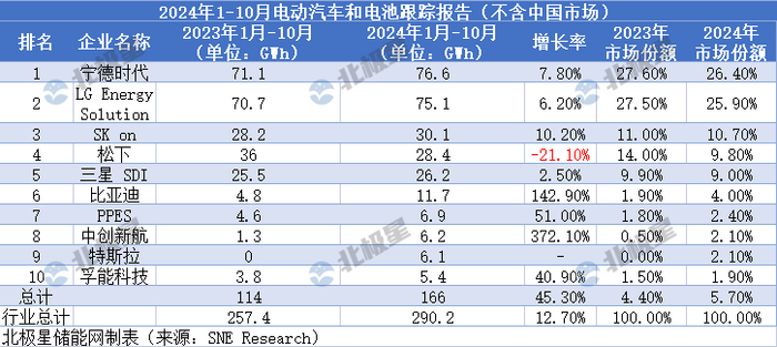 另,根据SNE Research还发布了一组不含中国市场的数据,显示2024年1月-10月全球电动汽车电池装机量(不含中国市场)达到290.2GWh。