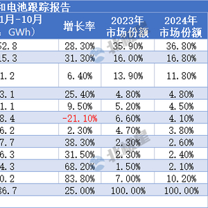 中创新航2024年1-10月市场份额相较于去年同期占比相同,4.8%,装机量增长了25.4%。