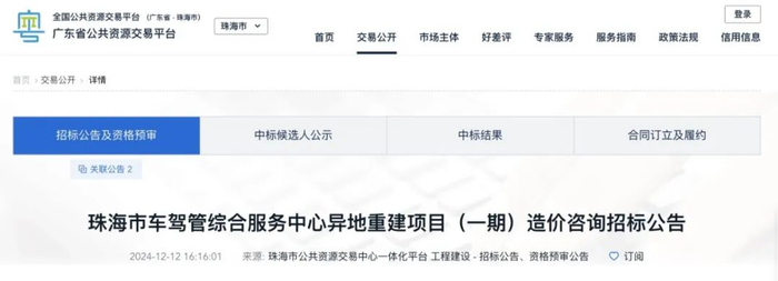 日前,广东省公共资源交易平台发布《珠海市车驾管综合服务中心异地重建项目(一期)造价咨询招标公告》(下称《公告》),对项目进行招标。