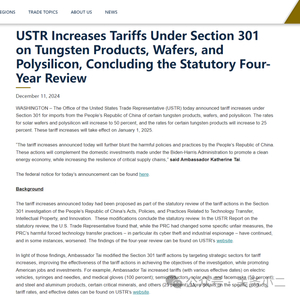 据USTR讯:美国贸易代表办公室于当地时间2024年12月11日发布正式通知,自2025年1月1日起: