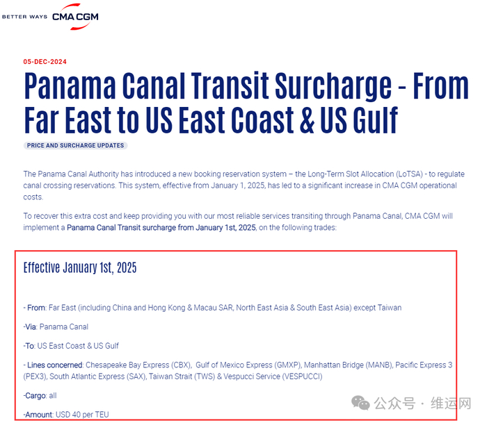 上周,CMA CGM同样发布公告,从2025年1月1日起征收“巴拿马运河过境附加费”,“以收回这一额外成本”,并“继续提供通过巴拿马运河的最可靠服务”。