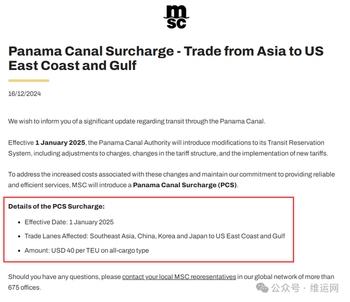 12月26日,MSC地中海海运发布公告通知客户,为了解决与这些变化相关的成本增加,并保持提供可靠和高效服务的承诺,MSC将引入巴拿马运河附加费(PCS)。