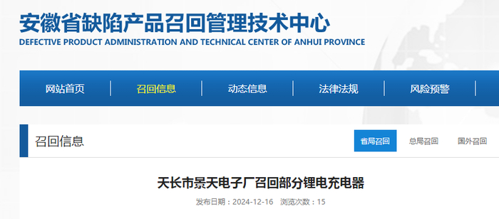 中国质量新闻网讯 日前,天长市景天电子厂按照《消费品召回管理暂行规定》的要求,向安徽省市场监督管理局、滁州市市场监督管理局报告了召回计划,将自即日起,召回2023年6月生产的锂电充电器(规格型号为DZL48201 48V2A),涉及数量2200只。