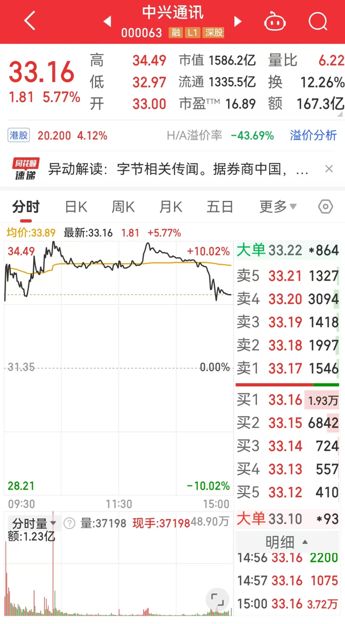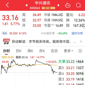 12月17日,截至收盘,中兴通讯(000063.SZ)股价上涨5.77%,报33.16元,成交额167.3亿元、总市值1586.2亿元。