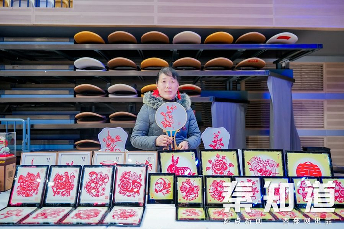 宝鸡市非物质文化遗产“陈仓剪纸”的代表性传承人王社平和她的作品。