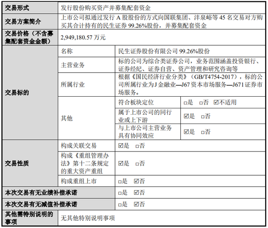 重组报告书披露,(1)本次交易上市公司拟发行股份购买民生证券99.26%股份,交易完成后,上市公司控股股东与标的公司将在期货业务方面新增同业竞争,标的公司及其子公司与上市公司及其子公司的原有业务将各自并行经营,按照相关监管要求需限期整合;(2)上市公司及其控股股东分别承诺,将进行资产和业务整合或采取其他合法方式,解决相关利益冲突、同业竞争问题,实现业务、资产等方面的有效整合,但仍存在整合不达预期的风险;(3)2021年8月起民生证券不再存在控股股东、实际控制人;(4)本次重组未设置减值补偿机制;(5)本次交易将募集不超过20亿元配套资金用于民生证券的业务发展,2024年3月末,扣除客户存款,上市公司、民生证券的账面货币资金分别为56.6亿元、44.9亿元。