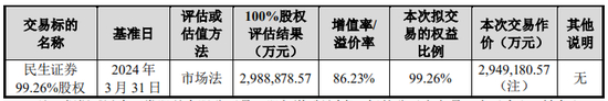 重组报告书披露,(1)以2024年3月31日为评估基准日,民生证券资产基础法估值163.59亿元,增值率1.93%;(2)其中,买入返售金融资产、融出资金、应收账款、其他债权投资、其他应收款评估值与账面价值基本一致,有充分理由相信能全部收回对关联方的应收账款和其他应收款等,评估风险损失的可能性为0%;(3)交易性金融资产、其他权益工具投资、交易性金融负债的评估值与账面价值基本一致,对于交易性金融资产——股票,区分流动股、限售股以及新三板股票,采用不同的评估方法评估;(4)长期股权投资未计提减值准备,民生基金评估减值21.06%。