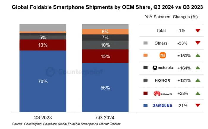 作为补充,此前研究机构Counterpoint更新的2024年第三季度全球折叠屏智能手机市场追踪报告显示:三星凭借56%份额遥遥领先,但相比去年同期来说份额下滑了21%。产品方面,三星Galaxy Z Fold 6表现未能达到预期,Galaxy Z Flip 6的销量也低于前代,如果2025年调整产品重心、“淡化”小折叠,也在情理之中。问问大家,你觉得小折叠市场还有前景吗?