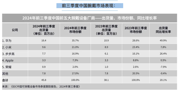 如上图所见,IDC数据显示2024年前三季度中国前五大腕戴设备厂商出货量依次是①华为 约1640万台,35.7%份额;②小米 约960万台,21%份额;③步步高 约770万台,16.9%份额(报告称其稳居中国儿童手表市场第一);④苹果 约330万台 7.3%份额;⑤荣耀 约90万台,2%份额;其它品牌合计约780万台,市占率达17%。