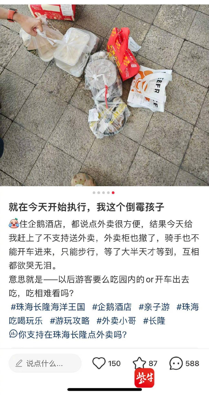 另一位顾客在网络平台如此描述他的点外卖经历:“带着孩子去珠海长隆玩,我决定点外卖,备注送到酒店房间。以前住任何酒店都没有遇到过这么艰难的外卖拿餐过程。今天的外卖员和我聊了很久,我才明白原因:1、前台不帮收外卖;2、以前的外卖柜拆了;3、现在不让外卖员骑车进园区。有的外卖员开车送外卖,骑电动车的外卖员只能全靠双腿跑进园区,而且酒店还不让他们进大厅附近。客户需要出去到处找外卖员,人生地不熟的我今天跑了好远才找到外卖员,拿到餐真是累死我了。”