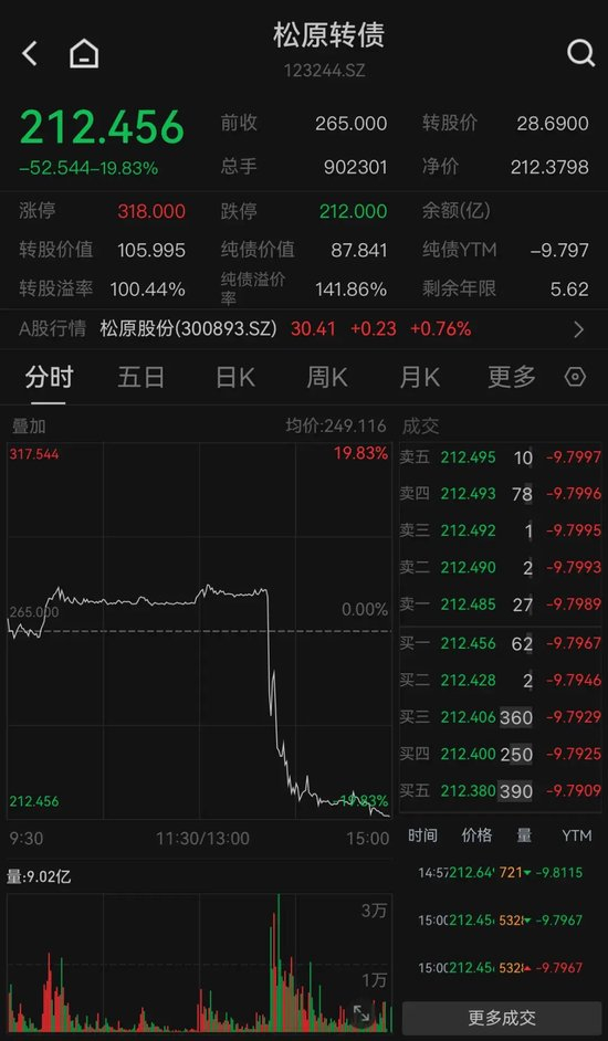 对于该转债突然闪崩的情形,分析人士认为,松原转债是今年8月上市的次新转债,上市后遭遇资金炒作,转债价格已经达到200元以上,转股溢价率超过100%,已脱离债券属性。炒作之后,或有资金不计成本“出逃”。