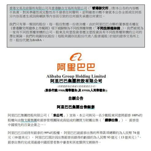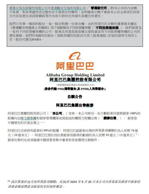 公告表示,银泰是中国领先的百货企业之一,阿里巴巴目前持有银泰约99%的股权。阿里巴巴就银泰出售的所得款项总额约为人民币74亿元(10亿美元),预计因出售银泰而录得的亏损约为人民币93亿元(13亿美元)。同时,银泰出售的完成须通过中国经营者集中审查和其他惯例交割条件。