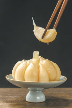 做糖蒜最好选用春播蒜,特别以“六瓣紫皮蒜”的品种为宜。从挑蒜、卤制、清洗、腌制、滚缸……经过上百天的腌制,出坛的糖蒜外形玲珑剔透、口感酸甜脆爽。食之开胃、解腻,还能给肠道杀菌、促进消化吸收。寒冬腊月时,窗外银装素裹,屋内家人齐聚,涮上一锅羊肉就着糖蒜享用,真如苏东坡所言:“人间有味是清欢。”