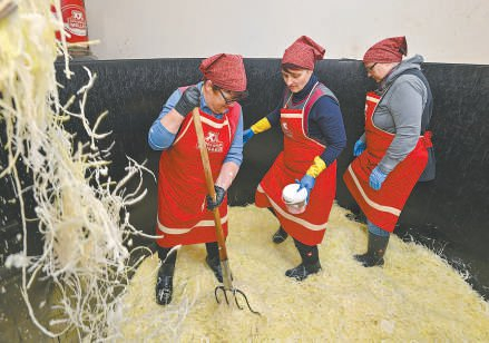 德国工人在巨大容器内用卷心菜制作酸菜。