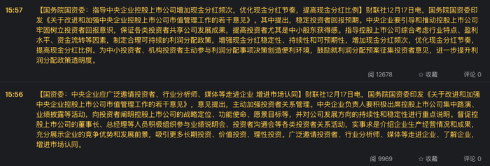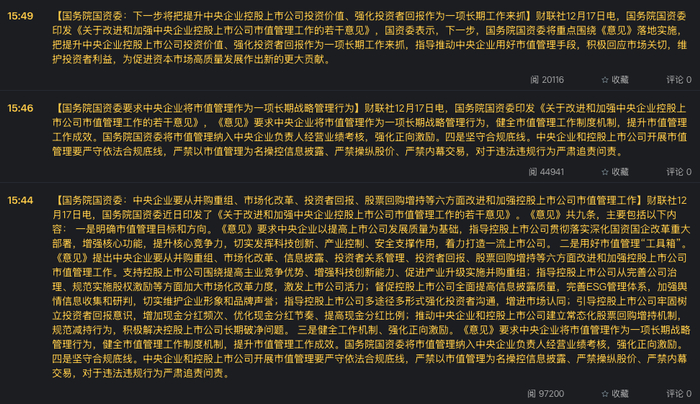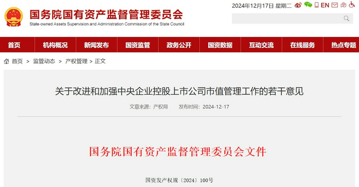 国务院国资委印发《关于改进和加强中央企业控股上市公司市值管理工作的若干意见》,国资委表示,下一步,把提升中央企业控股上市公司投资价值、强化投资者回报作为一项长期工作来抓。