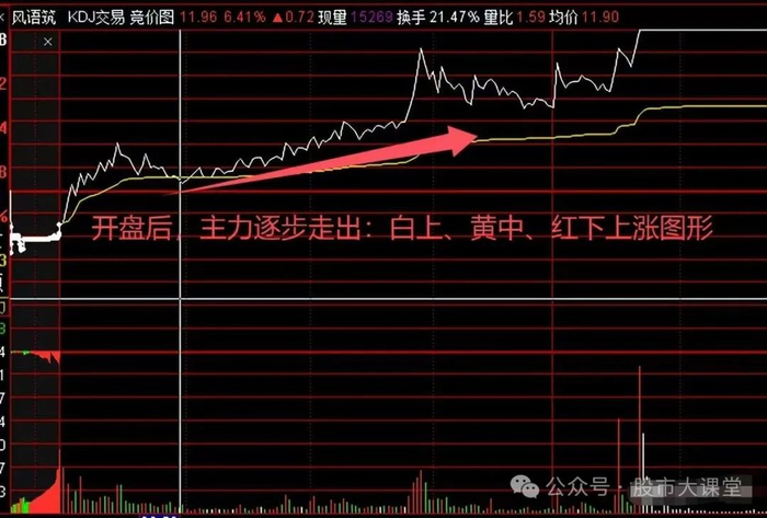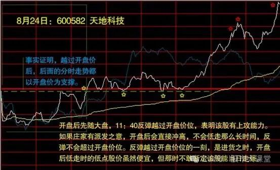 个股全天走势的强弱 ,在早盘就能显出预兆。在多空较量的第一个回合,大盘如果先下后上,而个股随大盘,但能反弹越过开盘价位,表明该股有上攻能力。如果庄家想派发,开盘后会直接冲高,不能开盘后低走,要有回调之心,反弹一般不会很快超过开盘价位。反弹越过开盘价位的一刻,是进货之时,开盘后落在低点的股价虽然便宜,但那时不敢断定该股能当日能否走强。开盘价必须涨幅1%以下,以1%到-2%为好。