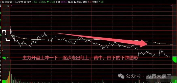 大盘高开幅度不大或低开,而个股却无端大幅度高开,有的甚至离涨停板很近,(有特别利好的股票会开盘就封上涨停),这时,要警惕庄家有开高出货的可能。也有大幅高开冲上涨停的情况,前提是日K线形态上攻凌厉或是有消息刺激。否则,一天还没开盘,即使有走高的欲望,一天有4个小时时间,何故高开?如果仓中股票出现这种情况,将短线获利落袋为安,以免后市股价落下,后悔没在高价卖出。通常这类个股全天走势结束,会在K线形态显示出光头阴线,预示后市暗淡。